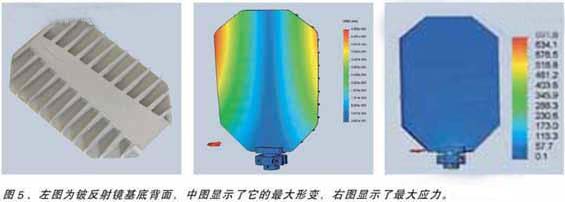 另外,基于模型計算優(yōu)化后的參數(shù)可確保最優(yōu)設計。由于較低密度和相對重量較高的楊氏模量值,鈹模型相對碳化硅模型的設計更為簡便。該材料的另一優(yōu)點是其吸附能力。對比碳化硅和鈹反射鏡,鈹模型比碳化硅少兩個臨界頻率。這將為伺服電路板和振鏡電機提供更為簡便的自動控制能力。結果是鈹反射鏡相對碳化硅反射鏡,重量減少35%,慣量減少35%。反射鏡設計,最大形變和最大應力如圖5所示。