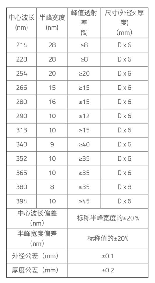 分為高性能窄帶、寬帶紫外帶通濾光片,光譜覆蓋范圍200nm~380nm。紫外帶通濾光片采用的是離子束輔助沉積工藝(IAD)和等離子輔助沉積工藝(PIAD)進(jìn)行制造,濾光片膜層為高密度硬膜,這就保證了長(zhǎng)久的使用壽命,為我們?nèi)蘸蟮姆€(wěn)定使用提供了保障。優(yōu)質(zhì)性能的紫外區(qū)帶通濾光片具備超高的截止背景深,可大幅提高系統(tǒng)信噪比。以下是為您列出的相關(guān)參數(shù)可供您參考選擇。